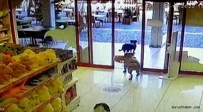 Güvenlik kamerasının kayıtlarında, bir alışveriş merkezindeki oyuncakçıya giren iki köpekten biri, etrafı izledikten sonra pelüş oyuncak köpeği ağzına alarak mağazadan çıkması yer aldı. Bu iki köpeğin mağaza kapısında bekleyen diğer köpeklerle birlikte bölgeden uzaklaştığı görüldü.