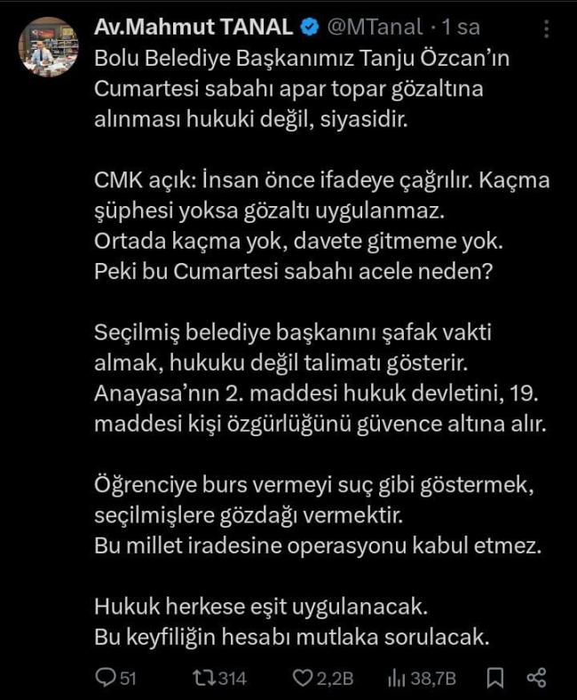 CHP’li Mahmut Tanal ise, Özcan’ın gözaltına alınmasını hukuki değil, siyasi bir operasyon olarak değerlendirdi.