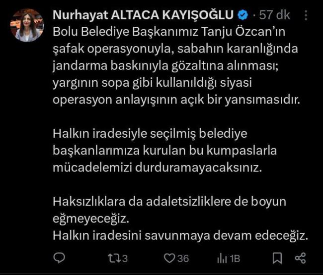 CHP Bursa Milletvekili Nurhayat Altaca Kayışoğlu da, operasyonu yargının siyasi amaçla kullanılması olarak nitelendirerek, halkın iradesine yönelik bir baskı olduğunu belirtti.