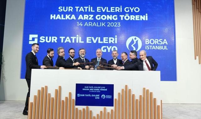 Borsa İstanbul'da gong, halka arz sürecini toplam hisse sayısının 2,88 katı kadar talep alarak başarıyla tamamlayan Sur Tatil Evleri GYO için çaldı. Açılış gongu, Borsa İstanbul AŞ Genel Müdürü Korkmaz Ergun, Sur Yapı Yönetim Kurulu Başkanı Z. Altan Elmas, Sur Yapı Genel Müdürü Ufuk Elmas, Sur Yapı Genel Müdür Vekili Atilla Elmas, Sur Yapı Yönetim Kurulu Üyesi Cem Hakan Elmas, Sur Tatil Evleri GYO Genel Müdürü Ömer Faruk Elmas, Ziraat Yatırım Genel Müdür Yardımcısı Akın Demirbağ, Integral Yatırım Genel Müdürü Kıvanç Memişoğlu tarafından çalındı.Borsa İstanbul AŞ Genel Müdürü Korkmaz Ergun, törendeki konuşmasında, "Sur Yapı, gayrimenkul alanında uzun yıllara dayanan deneyimini ve kurumsal hafızasını Sur Tatil Evleri GYO ile turizm sektörüne de taşımaktadır. Böylece yatırımcılarına büyüyen turizm sektöründe yatırım imkanı sağlamaktadır. Ülkemiz ekonomisinde önemli bir yer tutan gayrimenkul ve turizm sektörlerini tek bir yatırım aracında toplayan bu halka arz, yatırımcılarımıza farklı bir değer sunmaktadır. Bu nedenle bu başarılı halka arzda emeği geçen herkese, tüm şirket çalışanlarına ve aracı kuruma teşekkür ediyorum. Halka arzın, sermaye piyasalarımıza hayırlı olmasını diliyorum." dedi. Sur Yapı Yönetim Kurulu Başkanı Elmas da her günü başarılarla dolu 31 yıllık geçmişe sahip olan Sur Yapı'nın yepyeni bir döneme girdiğini belirterek, "Sur Yapı olarak her günü başarılarla dolu bir 31 yılı geride bırakırken yepyeni bir döneme girdik. Sur Tatil Evleri GYO'nun halka arzıyla sermaye piyasalarına bugün itibarıyla adım attık. Sur Tatil Evleri GYO'nun, ülkemizin her geçen gün gelişen, büyüyen ve nitelik kazanan gayrimenkul sektöründeki büyük fırsatlardan pay almamıza, ortaklarımızın yatırımlarını güvenle büyütmemize fırsat sağlayacağını biliyoruz. Tüm bu fırsat ve sorumluluklar, bize yeni ortaklarımızla birlikte büyüyeceğimiz günler vadediyor." ifadesini kullandı. 2 günlük talep toplama sürecinde Sur Tatil Evleri GYO'nun yatırımcıdan gördüğü yoğun talepten duydukları memnuniyeti dile getiren Elmas, Sur Tatil Evleri GYO'nun halka arzında, yüzde 80'i yurt içi bireysel yatırımcılara, yüzde 20'si yurt içi kurumsal yatırımcılara olmak üzere 2 milyar 213 milyon 100 bin lira değerinde 45 milyon lot hisseyi satışa sunduklarını söyledi.Elmas, "2 günlük talep toplama sürecinde bu rakamın 2,88 katı kadar talep aldık. 3,8 milyon yatırımcıya dağıtım gerçekleştirilen halka arzımızda yurt içi bireysel yatırımcılardan 61,9 milyon adet, yurt içi kurumsal yatırımcılardan 67,5 milyon adet talep toplandı." dedi. Muhabir: Fatma Eda Topcu