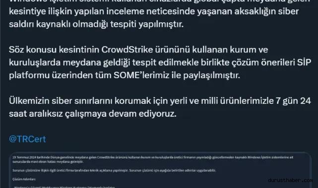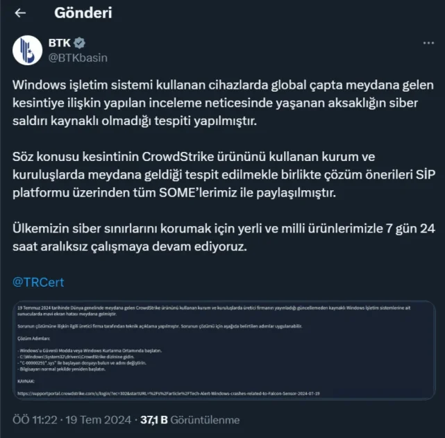 Söz konusu kesintinin CrowdStrike ürününü kullanan kurum ve kuruluşlarda meydana geldiği tespit edilmekle birlikte çözüm önerileri SİP platformu üzerinden tüm SOME’lerimiz ile paylaşılmıştır.BTK, Türkiye'nin siber sınırlarını korumak için yerli ve milli ürünleriyle 7 gün 24 saat aralıksız çalışmaya devam ettiklerinin bilgisini paylaştı.