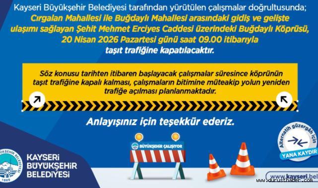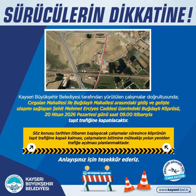 Kayseri Büyükşehir Belediyesi tarafından yürütülen çalışmalar kapsamında Cırgalan Mahallesi ile Buğdaylı Mahallesi arasında ulaşımı sağlayan Şehit Mehmet Erciyes Caddesi üzerindeki Buğdaylı Köprüsü, 20 Nisan 2026 Pazartesi günü saat 09.00 itibarıyla taşıt trafiğine kapatılacaktır.