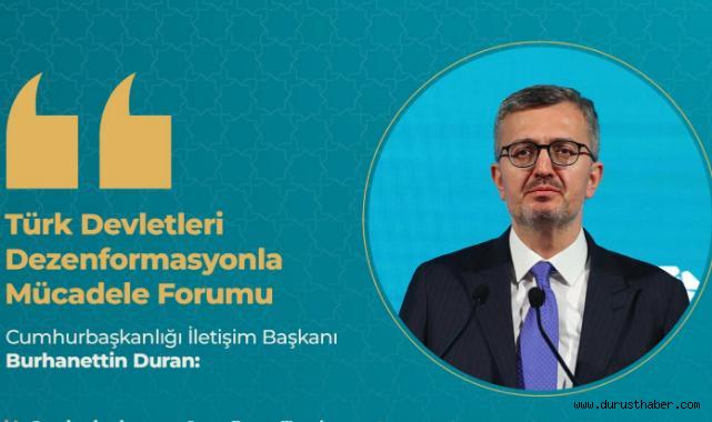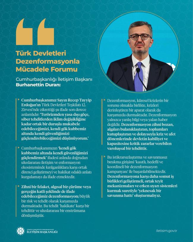 Cumhurbaşkanlığı İletişim Başkanı Burhanettin Duran, Türk Devletleri Dezenformasyonla Mücadele Forumu’nda önemli açıklamalarda bulundu. Duran, forum kapsamında ülkeler arası iş birliğinin güçlendirilmesi ve dezenformasyonla mücadelede ortak stratejilerin geliştirilmesinin önemine dikkat çekti.