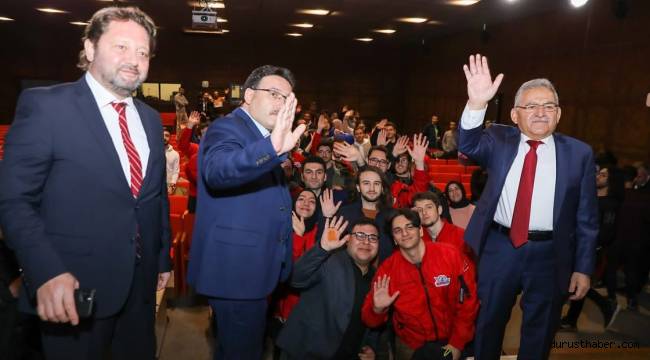 Konuşmasında birlik, beraberlik mesajları da veren Başkan Büyükkılıç, gençlerin yanında olduklarını vurgulayarak, “Biriz, beraberiz hep beraber Kayseri’yiz. Hep beraber gençlerin yanındayız. Bunun bir bereket olduğuna inanıyoruz. Kayseri büyükşehirlerin konforunu sunan büyükşehirlerin sıkıntısını en az yaşattığına inandığım bir şehir. Yatırımda 30 büyükşehir içerisinde birinci sıraya oturan bir şehir” dedi.Vali Gökmen Çiçek ise “Mustafa Varank bakanımız geldiğinde biz sizlerle bir araya geleceğiz diye söz vermiştik. Teknofest montların da geldiğini görüyorum, huzurlarınızdayız. Abdullah Gül Üniversitesi öğrencilerinin Türkiye çapında yaptığı dereceleri akademisyenlerin aldığı ödüllerin hatırı sayılır yer tuttuğunu biliyoruz” dedi.Vali Çiçek, Kayseri’nin Türk tarihinde bir başka şehir olduğunu belirterek, kentin tarihi öneminden bahsetti.Vali Çiçek ile Başkan Büyükkılıç, soru cevap şeklinde öğrencilerle sohbet havasında bir söyleşi gerçekleştirerek, gençlerin talep ve önerilerini de dinlediler.Öğrenciler, Başkan Büyükkılıç’a gençlere yönelik yaptığı anlamlı ve önemli hizmetlerden dolayı teşekkür ettiler.Söyleşide gençler, Sanayi ve Teknoloji Bakanı Mustafa Varank’ın Kayseri ziyaretlerinde söz verip, gönderdiği Teknofest montları giydi.