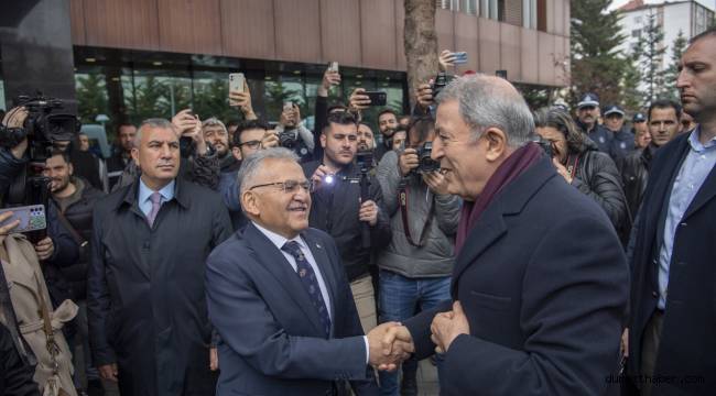 “MİLLETVEKİLİ ADAYLIĞINIZ HAYIRLI OLSUN”Başkan Büyükkılıç, birlik ve beraberlik mesajı vererek, şunları söyledi:“Şeref verdiniz sayın bakanım, inşallah ülkemizin gururu, dünya insanlığına savunma bağlamında her zaman katkı sağlayan, şehrimiz için adeta gurur olarak anacağımız anlayış içerisinde arkadaşlarımız ile birlikte milletvekili adaylığınız hayırlı olsun. Değerli genel başkan yardımcımızın tecrübesiyle, teşkilatlarımızın dinamiği ile Kayseri’ye layık olma anlayışıyla el ele bundan sonraki süreçte de çalışacağımızı umuyor, saygılar sunuyorum.”Başkan Büyükkılıç’a misafirperverliğinden dolayı teşekkür eden Bakan Hulusi Akar ise asrın felaketi olarak nitelendirilen deprem felaketi sonrası ilk andan itibaren gerekli tedbirleri aldıklarını ve vatandaşın yanına koştuklarını söyledi. Bakan Akar, yaraları sarmak için devlet ve milletin el ele verdiğine vurgu yapan Bakan Akar, konuşmasını şöyle sürdürdü:“Karşılıklı iş birliği içerisinde omuz omuza el birliğiyle bu deprem felaketlerinin yaralarını sarmak için mücadeleyi başlattık. İlk andan itibaren ve şu anda bu devam ediyor. Bu çerçevede bu devam ederken silahlı kuvvetlerimiz de bu milletin bağrından çıkan aynı zamanda peygamber ocağı olarak bilinen Türk Silahlı Kuvvetleri gerçekten ilk andan değil ilk saniyeden beri vatandaşın yanındaydı. Mehmetçik her zaman olduğu gibi bağrından çıktığı milletin her zaman yanındadır ve emrindedir. Diğer taraftan terörle mücadele, bildiğiniz gibi Mehmetçiğin büyük bir başarısı ile devam ediyor. Yurt içinde sınır ötesinde, görevlerinde Mehmetçik gerçekten hakkıyla yerine getirdi ve getiriyor. Şehitlerimizin bir tek damla dahi kanını yerde bırakmadık.”