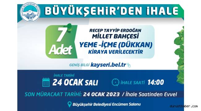 Kayseri Büyükşehir Belediyesi tarafından, Recep Tayyip Erdoğan Millet Bahçesi içerisinde bulunan 7 adet yeme-içme (dükkan) mekanı, “Kapalı Teklif Usulü” ihale ile ayrı ayrı 10 yıllığına kiraya verilecek.