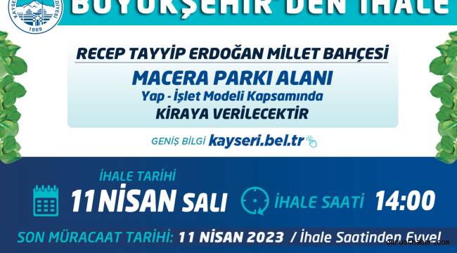 Kayseri Büyükşehir Belediyesi tarafından Recep Tayyip Erdoğan Millet Bahçesi içerisinde Yap-İşlet Modeli kapsamında Macera Parkı Alanı tesis edilmek üzere “Kapalı Teklif Usulü” ihale ile 10 yıllığına kiraya verilecek.