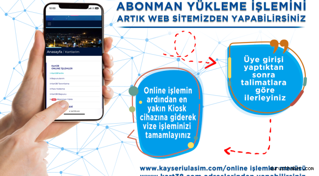 Kayseri Büyükşehir Belediyesi, ulaşım konusundaki hizmetlerini çeşitlendirerek arttırıyor. Bu kapsamda Büyükşehir Belediyesi, abonman ulaşım kartlarına internet aracılığı ile online yükleme hizmeti başlattı.Kayseri’de ulaşımı daha hızlı ve güvenli, daha konforlu hale getirmek konusunda sürekli çalışmalar yapan Büyükşehir Belediyesi, vatandaşların ulaşım kartlarına bakiye yüklenmesini kolaylaştıran uygulamaları da hayata geçiriyor. Bu anlamda daha önce ulaşımdan faydalanmak için temassız kredi kartları ve NFC özellikli telefonlar ile toplu taşıma ücreti ödeme yöntemlerini vatandaşın hizmetine sunan Büyükşehir Belediyesi, bu kez de toplu taşıma için kullanılan abonman kartlarına online olarak bakiye yükleme imkânı da tanıdı.Abonman yükleme işlemi online olarak, http://kart38.com yada http://kayseriulasim.com adreslerinden yapılabilirken, yükleme işleminin ardından en yakın kiosk cihazlarından vize işlemi tamamlanabilecek.