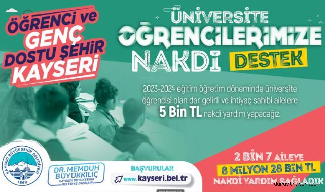 Büyükşehir Belediyesi tarafından 2023-2024 eğitim öğretim döneminde de üniversitede öğrencisi olan dar gelirli ve ihtiyaç sahibi ailelere 5 bin TL nakdî yardım yapılacak.Bu yıl nakdi destek 5 bin TL’ye yükselirken, başvurular 2 Ekim 2023 itibariyle başladı. 31 Ekim 2023 günü son bulacak başvurular, Büyükşehir Belediyesi’nin internet sitesi www.kayseri.bel.tr adresinde online hizmetler kısmından üniversitede öğrencisi olan aile yardımı başvuru formu üzerinden yapılacak.Online başvurunun dışında şahsen başvurular kabul edilmezken, başvuru incelemeleri 31 Aralık 2023 tarihine kadar sonuçlandırılacak. Ayrıca, incelemeler sonrası, ödemeler 2024 yılı Şubat ayında belediyenin belirlediği tarihte yapılacak.