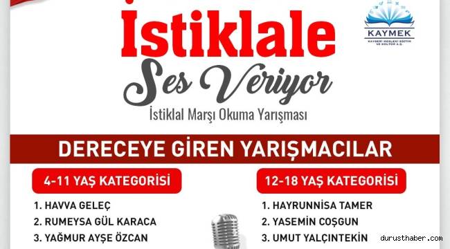 Kayseri il sınırları içerisinde eğitim gören veya ikamet eden 312 genç yarışmacının katılım sağladığı ‘İstikbal İstiklale Ses Veriyor’ İstiklal Marşı Okuma Yarışması’nda, İstiklal Marşı’na hâkimiyet, millî marş diline uygun okuma, duygu katma, dekor, seslendirme hızı, beden dili, vurgu, tonlama ve diksiyon gibi kriterler göz önünde bulundurularak başvurular hassasiyetle değerlendirildi. Büyükşehir Belediye Başkanı Dr. Memduh Büyükkılıç’ın da katılacağı ödül töreninde, değerlendirme sonucu 4-11 yaş grubu ve 12-18 yaş grubu olmak üzere iki farklı kategoride dereceye giren gençlerden birincilere 10” tablet, ikincilere 8” tablet ve üçüncülere 7” tablet; mansiyon olarak üçer kişiye akıllı saat armağan edilecek.Yarışmada dereceye girenlerin isimleri ise şu şekilde sıralandı;4-11 Yaş Grubu; birinci Havva Geleç, ikinci Rumeysa Gül Karaca, üçüncü Yağmur Ayşe Özcan, mansiyon 1 Hanne Ada Çınar, mansiyon 2 Sıla Avcı, mansiyon 3 Elif Rana Oflaz. 12-18 Yaş Grubu; birinci Hayrunnisa Tamer, ikinci Yasemin Coşgun, üçüncü Umut Yalçıntekin, mansiyon 1 Gizem Nur Uysal, mansiyon 2 Fatmanaz Ulutaş, mansiyon 3 Medine Döndü Koç. Jüri Özel Ödülleri; 4-11 yaş grubu; Ayşe Uzunlu, Umut Kemal Dursun, Rüveyda Karabulut, Esra Tahta ve Ebrar Gökalp.