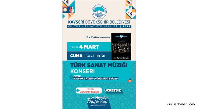 Büyükşehir Belediyesi Konservatuarı Türk Sanat Müziği Korosu, Kayseri İl Kültür Müdürlüğü Salonu’nda 4 Mart Cuma saat 19.30’da Burhan Surluev şefliğinde Kürdilihicazkâr Konseri ile eşsiz parçalar seslendirecek.