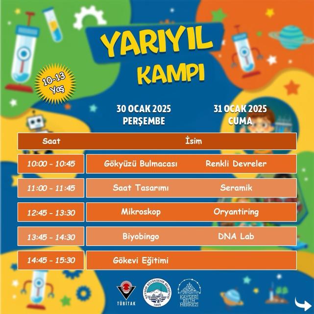 Bu kapsamda Kayseri Bilim Merkezi, 17 Ocak 2024’te öğrencilerin yaşadığı karne heyecanı ile başlayan 2024-2025 Eğitim Öğretim Yılı yarıyıl tatiline dolu dolu bir kamp hazırladı.Kayseri Bilim Merkezi’nin düzenlediği 21 Ocak’ta başlayıp ikişer günlük 4 kamp şeklinde gerçekleşen yarıyıl kampı, öğrencilerin verimli ve keyifli bir tatil geçirmelerine katkı sundu. Büyükşehir, yarıyıl kampı ile öğrencilerin bilim ve teknolojiye olan ilgisini arttırırken, yaratıcı düşünme becerilerini geliştirdi ve farklı bilimsel alanlarda uygulamalı eğitimler almalarını sağladı. Kayseri Bilim Merkezi, kampta çeşitli atölye çalışmaları, deneyler, robotik kodlama gibi konularda etkinliklerle öğrencileri eğlendirirken, onlara yeni bilgiler öğretti.Yarıyıl kampının 1’inci ve 2’nci dönemi, 21 Ocak’ta başlayıp 24 Ocak’ta sona eren program kapsamında Kukla Atölyesi, Mikro Dünya, Algoritma, Renklerin Fiziği ve Gökevi Eğitimi Oyun Hamuru Devresi, Piksel Kodlama, Anatomi Dedektifi, Maket Uçak, Mikro Dünya, Doğadaki Elektrik ve Oryantiring atölyeleri düzenlendi.Katılımcılar, eğitmenler eşliğinde eğlenceli bir şekilde bilimsel kavramları öğrenirken, aynı zamanda grup çalışmaları ile sosyal becerilerini de geliştirdi.Yarıyıl kampına yoğun ilgi gösteren minikler, Kayseri Büyükşehir Belediye Başkanı Dr. Memduh Büyükkılıç ve Kayseri Bilim Merkezi ekibine teşekkürlerini ileterek, kampların devamı yönündeki isteklerini de dile getirdiler.Öte yandan Yarıyıl 3’üncü ve 4’üncü dönem kampları, 28-31 Ocak günleri arasında gerçekleşecek.