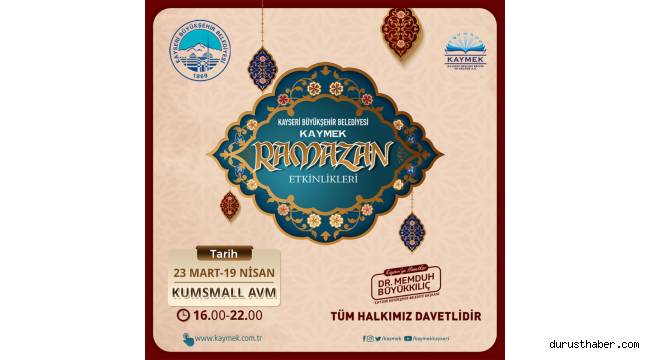 Büyükşehir Belediye Başkanı Dr. Memduh Büyükkılıç’ın talimatları doğrultusunda yılın her dönemi, eğitim faaliyetlerinin yanı sıra kültür sanat etkinliklerini de sürdüren KAYMEK, bu Ramazan Ayı’nda da çeşitli etkinlik ve aktivitelerle Kayserililerle bir araya gelecek.KAYMEK, Kumsmall AVM’de düzenleyeceği ‘Ramazan Etkinlikleri’ programı ile vatandaşlara Ramazan’ın heyecanını yaşatacak. Ramazan Ayı boyunca sürecek etkinliklerde düzenlenecek KAYMEK’le Öğreniyorum, el sanatları workshopları, Çocuk şenliği ve Osmanlı Fotoğrafçılığı aktivitelerin yanı sıra vatandaşlar kurulan kaymek El Sanatları ürün satış standından da el emeği göz nuru eserleri satın alabilecek.Kayserililer, düzenlenecek Workshoplar’de çeşitli el sanatlarını öğrenme şansı yakalarken, çocuklar da etkinlikte doyasıya eğlenecek.KAYMEK, Ramazan Etkinlikleri kapsamında 23 Mart-19 Nisan tarihleri arasında her gün yetişkin ve çocuklara Ramazan Ayı’nın sevincini akranlarıyla birlikte zengin ve eğlenceli içeriğe sahip etkinliklerde paylaşma fırsatı sunacak.