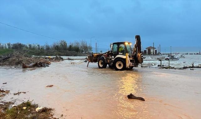 Çayın denizle bağlandığı noktadaki köprünün akış menfezlerini tıkayan ağaçlar, iş makineleriyle bulundukları yerden kaldırıldı. Tıkanan çayın denize daha kolay akması sağlandı.