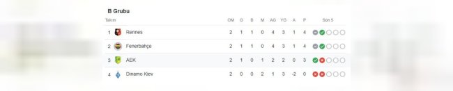UEFA AVRUPA LİGİ B GRUBU PUAN DURUMU