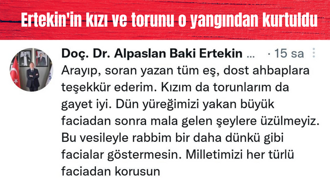 Dün akşam saatlerinde İstanbul Fikirtepe’de 24 katlı rezidansta yangın çıktı. Çıkan yangın itfaiye ekipleri tarafından kontrol altına alındı. Korkutan yangında kimseye bir şey olmaması sevindirdi. Rezidansta Erciyes Anadolu Holding CEO’su Alpaslan Baki Ertekin’in kızı ve torunlarının da olduğu öğrenildi. Sosyal medya hesabından paylaşım yapan Ertekin, kızı ve torunlarının durumlarının iyi olduğunu belirtti. Ertekin, “Arayıp, soran yazan tüm eş, dost ahbaplara teşekkür ederim. Kızım da torunlarım da gayet iyi. Dün yüreğimizi yakan büyük faciadan sonra mala gelen şeylere üzülmeyiz. Bu vesileyle rabbim bir daha dünkü gibi facialar göstermesin. Milletimizi her türlü faciadan korusun” ifadelerine yer verdi.