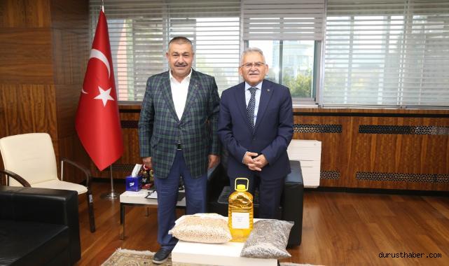 Kayseri Büyükşehir Belediye Başkanı Dr. Memduh Büyükkılıç, Kayseri Ziraat Odaları İl Koordinasyon Kurulu ve Kocasinan Ziraat Odası Başkanı Abdulkadir Güneş’i makamında kabul etti. Güneş, Başkan Büyükkılıç’a, Büyükşehir Belediyesi tarafından tohum dağıtımı yapılan ve çiftçilerin ürettiği organik ürünleri takdim etti.