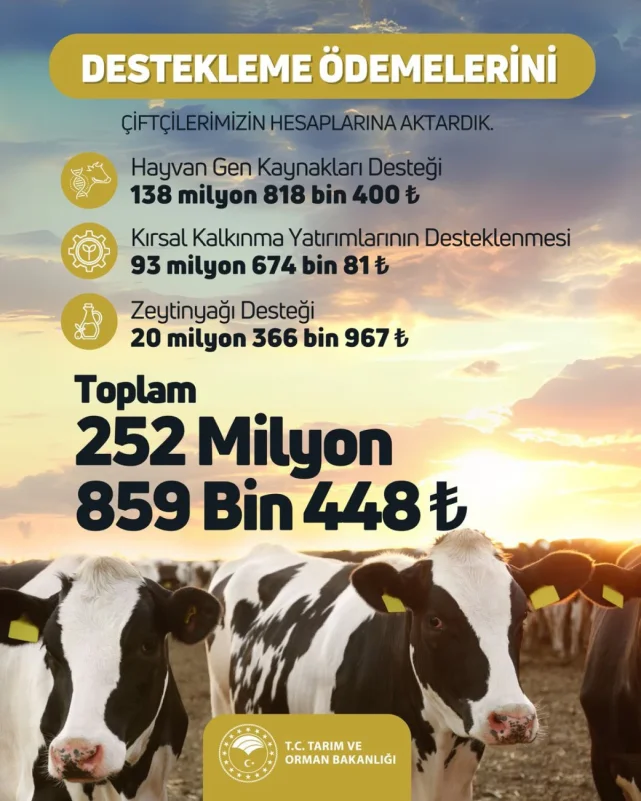 DESTEĞİN DAĞILIMIPaylaşımda, "Hayırlı ve bereketli olsun." denilerek şu ifadelere yer verildi:Hayvan gen kaynakları desteği 138 milyon 818 bin 400 lira, kırsal kalkınma yatırımlarının desteklenmesi 93 milyon 674 bin 81 lira, zeytinyağı desteği 20 milyon 366 bin 967 lira olmak üzere toplam 252 milyon 859 bin 448 lira tarımsal destekleme ödemesini çiftçilerimizin hesaplarına aktardık.