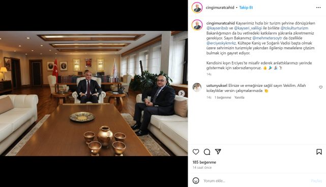 Cıngı paylaşımında Ersoy'un; Erciyes Kayak Merkezi, Kültepe Kaniş-Karum ve Soğanlı Vadisi başta olmak üzere Kayseri'deki turizm noktalarıyla yakından ilgilenip meselelere çözüm bulmak için gayret ettiğini belirtti.