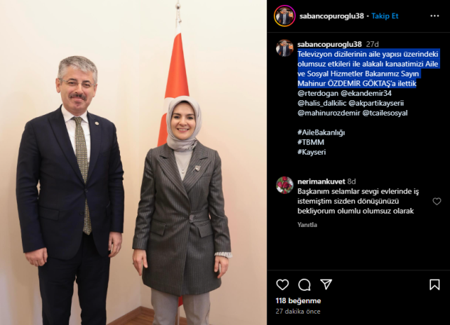 Adalet ve Kalkınma Partisi Kayseri Milletvekili Şaban Çopuroğlu, Aile ve Sosyal Hizmetler Bakanı Mahinur Özdemir Göktaş'ı ziyaret etti.Ziyaretle ilgili sosyal medya hesabından bir paylaşım yapan Çopuroğlu, ziyarette ''Televizyon dizilerinin aile yapısı üzerindeki olumsuz etkileri'' konusunda bir görüşme gerçekleştirildiğinin altını çizdi.Çopuroğlu, konuyla ilgili yaptığı paylaşımda ''Televizyon dizilerinin aile yapısı üzerindeki olumsuz etkileri ile alakalı kanaatimizi Aile ve Sosyal Hizmetler Bakanımız Sayın Mahinur ÖZDEMİR GÖKTAŞ’a ilettik'' ifadelerine yer verdi.