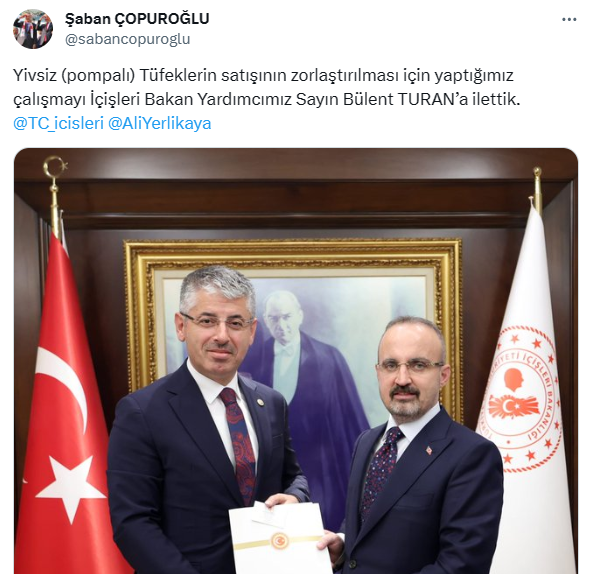 Çopuroğlu tarafından pompalı tüfeklerin satışının zorlaştırılmasına ilişkin yasa tasarısı önergesini İçişleri Bakan Yardımcısı Bülent Turan’a iletildi.Çopuroğlu paylaşımında ''Yivsiz (pompalı) Tüfeklerin satışının zorlaştırılması için yaptığımız çalışmayı İçişleri Bakan Yardımcımız Sayın Bülent TURAN’a ilettik.'' ifadelerine yer verdi.
