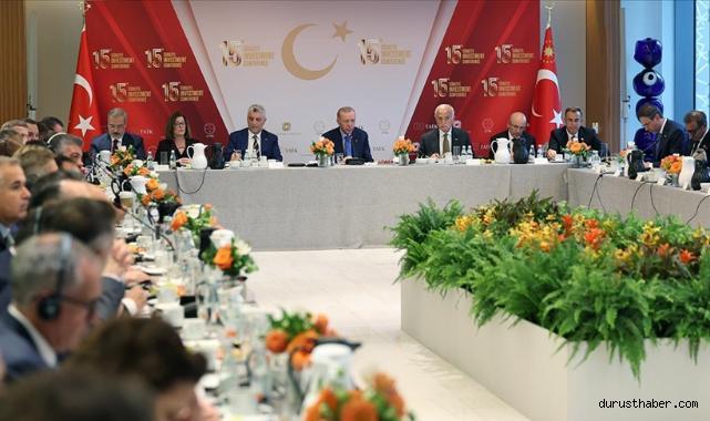 Türkiye-ABD İş Konseyi (TAİK) tarafından düzenlenen 15. Türkiye Yatırım Konferansı çerçevesinde Amerikalı ve Türk iş insanları ile bir araya gelen Erdoğan, ABD Ticaret Odası, ABD Türkiye İş Konseyi ile DEİK'e bağlı Türk-Amerikan İş Konseyine bu toplantıya vesile oldukları için teşekkür etti.Erdoğan, artık bir gelenek haline gelen bu buluşmanın iki ülke iş çevrelerine yeni işbirlikleri ve ortaklıklar için önemli bir imkan sunduğuna inandığını belirterek, "Ekonomik ve ticari konular Amerika'yla münasebetlerimizin en önemli boyutlarından birini teşkil ediyor. Amerika son iki senedir en fazla ihracat yaptığımız ikinci, en fazla ithalat yaptığımız beşinci ülke oldu. İkili ticaret hacmimiz geçtiğimiz yıl 30 milyar doları aştı. Pek çok defa ifade ettiğim üzere ikili ticaret göstergelerini istikrarlı şekilde arttırmak için büyük bir potansiyele sahibiz." ifadelerini kullandı.Ticarette 100 milyar dolarlık ortak hedefe iyi bir planlamayla ulaşabileceğine bütün samimiyetiyle inandığını ifade eden Erdoğan, "Bunun için demir çelik ve alüminyum sektöründeki ilave gümrük vergileri, soruşturmalar ve CAATSA yaptırımları gibi tek taraflı uygulamaların artık terk edilmesi gerekiyor. Siz sektör temsilcilerinden de ilgili kurumlar nezdinde karşılıklı olarak kaybetmemize neden olan engellemelerin kaldırılması amacıyla gerekli girişimlerde bulunmanızı bekliyoruz." diye konuştu.Erdoğan, Türkiye'nin büyük, güçlü ve potansiyeli son derece yüksek bir ekonomiye sahip olduğunu, bugün dünyada hem nüfusu 85 milyon hem de kişi başına geliri 13 bin doların üzerinde olan ABD, Japonya, Rusya, Meksika ile 5 ülkeden biri olduğunu dile getirdi.