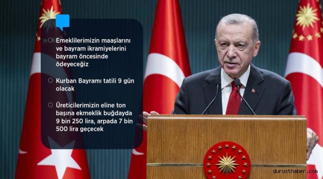 "Bir güzel haberimiz de emeklilerimize olacak. Emeklilerimizin maaşlarını ve bayram ikramiyelerini inşallah Kurban Bayramı öncesinde ödeyeceğiz. Asgari Ücret Tespit Komisyonumuzda çalışmalara başlıyoruz. Son olarak Kurban Bayramı ile ilgili özellikle turizm sektörümüzü hareketlendireceğine inandığım bir müjdeyi paylaşmak istiyorum. Bu sene Kurban Bayramımızı 28 Haziran ile 1 Temmuz arasında idrak edeceğiz. İstişarelerimiz neticesinde 26 ve 27 Haziran günlerini de idari izin kapsamına almayı kararlaştırdık. Hafta sonlarıyla birlikte vatandaşlarımız toplam 9 gün bayram tatili yapma imkanı bulacaktır."