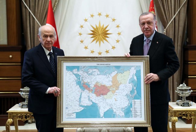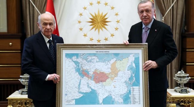 Cumhurbaşkanı Erdoğan, Cumhurbaşkanlığı Külliyesi'nde MHP Genel Başkanı Devlet Bahçeli'yi kabul etti. Saat 14.10'da başlayan görüşme öncesi iki lider Türk Dünyası Haritası ile birlikte poz verdi. Görüşme basına kapalı devam ediyor.