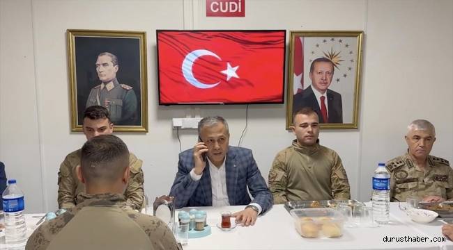 Üs bölgesindeki askerlerle bir süre sohbet eden Yerlikaya, telefonda görüştüğü Cumhurbaşkanı Recep Tayyip Erdoğan'ın Babalar Günü'nü tüm personel adına kutladı.Yerlikaya'nın telefonundan hitap ettiği personele teşekkür eden Cumhurbaşkanı Erdoğan, "Cudi'de, Gabar'da sizler bizim her an iftihar vesilemiz oldunuz. Bu vesileyle şahsım ve milletim adına bütün kardeşlerimizi gözlerinden öpüyorum. Terörle mücadelemizde sizlerin duruşu inşallah bu milletin huzuru ve refahı olacaktır. Rabbim yar ve yardımcımız olsun, birliğimizi ve beraberliğimizi daim kılsın. Hepinizi Allah'a emanet ediyorum." diye konuştu.Bakan Yerlikaya'ya, Jandarma Genel Komutanı Orgeneral Arif Çetin ve Emniyet Genel Müdürü Mehmet Aktaş da eşlik etti.