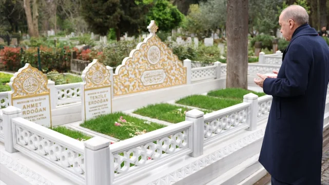 Ramazan Bayramı’nın son gününde Cumhurbaşkanı Recep Tayyip Erdoğan, İstanbul’daki Karacaahmet Mezarlığı’na giderek merhum anne ve babasının mezarlarını ziyaret etti.DUALARLA ANNE-BABASINI YÂD ETTİErdoğan, annesi Tenzile Erdoğan ve babası Ahmet Erdoğan’ın kabirleri başında bir süre vakit geçirerek dua etti. Sessiz ve mahzun bir atmosferde gerçekleşen ziyarette Cumhurbaşkanı, ebeveynlerinin hatırasını bir kez daha yâd etti.