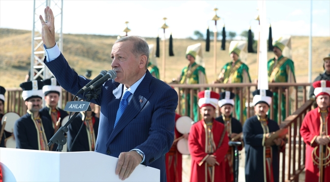 Cumhurbaşkanı Erdoğan, Malazgirt Zaferi'nin 952. yıl dönümü dolayısıyla Ahlat'taki etkinlik alanını ziyaretinde konuştu.Malazgirt Zaferi'nin 952. yıl dönümünün hayırlara vesile olmasını dileyen Erdoğan, "Bir sene sonra bizleri, şehitlerimizin mübarek kanlarıyla yoğrulmuş bu topraklarda tekrar buluşturan Rabb'imize hamdediyorum. Malazgirt'in temsil ettiği değerlere samimiyetle sahip çıkan Ahlat halkını, canıgönülden tebrik ediyorum. Özellikle, istikbalimizin teminatı olan gençlerimizi, Malazgirt ruhunu yaşattıkları için kutluyor, her birinin alnından öpüyorum." ifadelerini kullandı. Bugün bir kez daha "demiri demirle dövenlerin, Anadolu'yu aşkla yoğuranların" destanına şahitlik ettiklerini belirten Erdoğan, konuşmasını şöyle sürdürdü:"Bugün bir kez daha, cesaretleri ve mücadeleleriyle ölümü öldüren yiğitlerin hikayelerini yeniden hatırlıyoruz. Dünyaya insan hakları ve demokrasi dersi verenlerin çoğu, geçmişteki ayıpları nasıl örteceğini düşünürken, biz hamdolsun ecdadın zaferlerini şeref madalyası olarak göğsümüzde iftiharla taşıyoruz. Bizi anlamak, bizi tanımak isteyenler, hiç uzağa gitmesin, buraya gelsin. Türk milletinin şanlı tarihini öğrenmek isteyenler, Ahlat'ı ve Malazgirt'i ziyaret etsin."