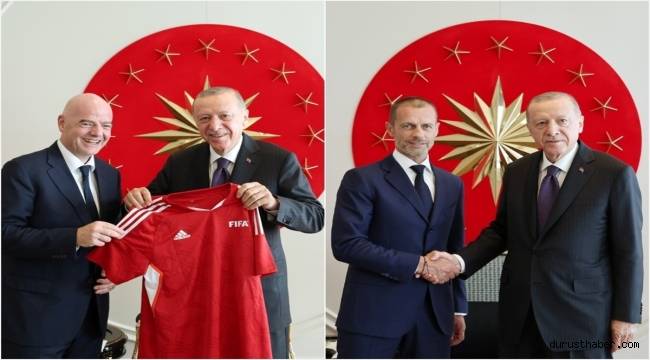 Kabul, Atatürk Havalimanı Devlet Konukevi'nde basına kapalı gerçekleşti.Görüşmede Infantino'nun Cumhurbaşkanı Erdoğan'a forma ve kaptanlık pazubandı hediye ettiği öğrenildi.Cumhurbaşkanı Erdoğan, UEFA Başkanı Ceferin'i kabul ettiCumhurbaşkanı Recep Tayyip Erdoğan, 2023 UEFA Şampiyonlar Ligi Finali için İstanbul'da bulunan Avrupa Futbol Federasyonları Birliği (UEFA) Başkanı Aleksander Ceferin'i kabul etti.Kabul, Atatürk Havalimanı Devlet Konukevi'nde basına kapalı gerçekleşti.