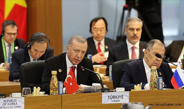 Ayrıca çeşitli gıda güvenliği girişimlerinde aktif rol oynamayı insani dış politikanın önemli bir unsuru olarak gördüklerini dile getiren Erdoğan, "Karadeniz Tahıl Koridoru Girişimi"nin küresel gıda fiyatlarının hızla artmasını önlediğini, kıtlık riskini azaltmaya katkıda bulunduğunu ifade etti.