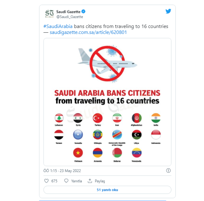 Suudi vatandaşlarının seyahat etmesinin yasaklandığı ülkeler Türkiye, Lübnan, Suriye, İran, Afganistan, Hindistan, Yemen, Somali, Etiyopya, Demokratik Kongo Cumhuriyeti, Libya, Endonezya, Vietnam, Ermenistan, Belarus ve Venezuela'yı içeriyor.