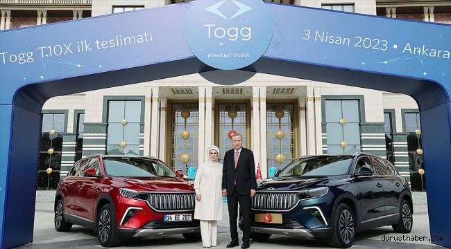 Cumhurbaşkanı Erdoğan ve eşi Emine Erdoğan, üzerinde Cumhurbaşkanlığı forsu olan "Gemlik" renkli Togg makam aracı ve Emine Erdoğan'a ait 34 EE 2071 plakalı "Anadolu" renkli Togg'un önünde poz verdi.Sanayi ve Teknoloji Bakanı Mustafa Varank ile Togg'un ortağı "babayiğitler", Cumhurbaşkanı Erdoğan ve eşi Emine Erdoğan'a hayırlı olsun dileklerini iletti. Erdoğan ve eşi Emine Erdoğan'a içinde araçlara ait anahtar ve ruhsat ile kolonya ve kestane şekerinin yer aldığı kitler teslim edildi."Türk milletinin 60 yıllık hayalinin gerçeğe dönüşmesine hep birlikte şahitlik ettik"Erdoğan, burada yaptığı konuşmada, bugün Türk milletinin 60 yıllık hayalinin gerçeğe dönüşmesine hep birlikte şahitlik ettiklerini belirtti.Ülkenin gururu yerli ve milli marka Togg'un ilk siparişini 2019 yılında verdiklerini, bugün de ilk akıllı cihazı teslim aldıklarını ifade eden Erdoğan, sözlerini şöyle sürdürdü:"Türkiye Yüzyılı'nın ilk meyvelerinden olan Togg'un tüm milletimize hayırlı uğurlu olmasını diliyorum. Togg ülkemizin teknolojik gelişiminin, ekonomik kalkınmasının ve küresel itibarının sembolü olarak doğmuş, gelişmiş ve bugünkü seviyesine gelmiştir. Biliyorsunuz, bu proje daha fikir aşamasındayken başlayan, halen devam eden haksız eleştiriler, ithamlar, iftira derecesine varan bühtanlar yöneltildi. Devrim otomobili için yürütülen tezviratın katbekat fazlası Togg için yapıldı. Peki ne oldu? Tasarımı yapıldı, fabrikası kuruldu, üretildi ve satışa çıktığı ilk gün Togg sipariş rekorları kırdı."Cumhurbaşkanı Erdoğan, Togg'un tüm testleri alnının akıyla verdiğini, elektrikli araç güvenlik testinden tek seferde geçmeyi başarmış özel bir otomobil olduğunu söyledi."İnşallah bugünden itibaren Togg'u yollarda görmeye başlıyoruz." diyen Erdoğan, şunları kaydetti:"Tüm babayiğitleri, şirket yöneticilerini, projede emeği geçen herkesi bir kez daha tebrik ediyor, ülkemize ve milletimize hayırlı olmasını diliyorum. Adeta eline kına yakılıp ana ocağından uğurlanan askerler gibi, kuşağı bağlanıp baba evinden çıkarılan gelinler gibi milletimizin gözbebeği olan Togg'u da yine milletin evinden yollara uğurluyoruz. Yolun da bahtın da açık olsun diyorum Togg. Rabb'im tekerine taş değdirmesin."Daha sonra Cumhurbaşkanı Erdoğan eşi Emine Erdoğan ile "Anadolu" renkli Togg'a bindi. Erdoğan çifti Togg Üst Yöneticisi (CEO) Gürcan Karakaş'tan araca ilişkin bilgi aldı.Cumhurbaşkanı Erdoğan'ın kaptanlığında eşi Emine Erdoğan, Sanayi ve Teknoloji Bakanı Varank ve Gürcan Karakaş, Cumhurbaşkanlığı Külliyesi etrafında Togg ile tur attı.Erdoğan, daha sonra gazetecilerin sorularını cevapladı. "Neler hissettiniz?" sorusu üzerine Erdoğan, "Bu heyecanı sizler nasıl duyuyor ve hissediyorsanız bizler de çok daha fazlasıyla hissettik." ifadesini kullandı."Şimdi sadece Türkiye'nin yollarında değil, dünya yollarında da Togg'u izleyeceğiz"Devrim otomobili meselesinin ne tür kargaşalara vesile olduğunun bilindiğini anımsatan Erdoğan, "Devrim otomobilinden sonra bize de 'devrin otomobili'ni hamdolsun üretmek nasip oldu. Şimdi sadece Türkiye'nin yollarında değil, dünya yollarında da 'devrin otomobili Togg'u izleyeceğiz, takip edeceğiz." dedi.Erdoğan, Togg'da sürat, konfor gibi ne aranılıyorsa bulunabileceğini belirterek, kullandıkları "Anadolu" renkli Togg'un eşi Emine Erdoğan'a ait olduğunu, bu rengi ve plakayı eşinin seçtiğini söyledi.Erdoğan, Cumhurbaşkanlığı forsu bulunan diğer Togg T10X'e işaret ederek, "Bizimki de burada. Makam otomobili olarak inşallah onu da kullanacağız." dedi.Azerbaycan Cumhurbaşkanı İlham Aliyev'e de teslimatın yapılıp yapılmadığının sorulması üzerine Erdoğan, teslimatın yarın yapılacağını, o otomobilin renginin de "Anadolu" olduğunu ifade etti.Erdoğan, "Özbekistan Cumhurbaşkanı Şevket Mirziyoyev'e de gidecek. Randevu bekleniyor." diye konuştu.Togg'a 177 bin ön siparişin alındığına da işaret eden Erdoğan, "Şu anda Gürcan Beyler üretim olarak yetiştirebilseler bu sayı zaten 177 de 277 de olur. Talihlisi çok. Bizden torpil isteyen var. Dedik, biz torpil işine bakmayız." şeklinde konuştu."Aracı özendirmek adına kamu bankaları bir kredi paketi açıklar mı? Bu bir teşvik mekanizması olarak gündeme gelebilir mi?" sorusuna da Erdoğan, "Olabilir. Niye olmasın? Çünkü kamu bankalarının bu noktada kredi yastıkları müsaittir. Hele hele araçlara bunu rahatlıkla yapabilirler. Aynı şekilde konutlarda bunu nasıl yapıyorsak otomobilde de bunu yamak mümkündür." yanıtını verdi.Emine Erdoğan: Ülkem adına gurur duyuyorumCumhurbaşkanı Erdoğan'ın eşi Emine Erdoğan ise tarihi bir anın hep birlikte paylaşıldığını belirtti.Togg'un Türkiye'nin gurur kaynağı olduğuna işaret eden Emine Erdoğan, "Ülkem adına gurur duyuyorum. Arabanın kullanımı da çok rahat. İçinde kendinizi huzurlu hissediyorsunuz. Emeği geçenlere teşekkür ediyorum. Harika bir araç. Hayırlı olsun." diye konuştu.Plakadaki 2071 vurgusunun sorulması üzerine Cumhurbaşkanı Erdoğan, "EE, hanımın ismi ile müşterek soyadımız. 2071 de Malazgirt'in buraya yansımış olan tarihi. 1071'den sonra 2071 inşallah bizim için ayrı bir vizyon olacak." dedi.Erdoğan çifti daha sonra programı takip eden gazetecilerle fotoğraf çektirdi. Törene Cumhurbaşkanı Yardımcısı Fuat Oktay, Cumhurbaşkanlığı İletişim Başkanı Fahrettin Altun, Cumhurbaşkanlığı Sözcüsü İbrahim Kalın da katıldı.