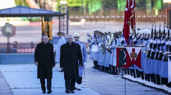 Cumhurbaşkanı Erdoğan, Bermudez'i külliyenin ana giriş kapısında karşıladı.Erdoğan ve Bermudez'in tören alanındaki yerlerini almasının ardından 21 pare top atışı eşliğinde iki ülke milli marşları çalındı. Küba Devlet Başkanı Bermudez, Muhafız Alayı Tören Kıtası'nı "Merhaba asker" diyerek Türkçe selamladı.Törende, tarihte kurulan 16 Türk devletini temsil eden bayraklar ve askerler de yer aldı.İki ülke heyetlerinin takdimi sonrasında Cumhurbaşkanı Erdoğan ve Bermudez, merdivenlerde Türkiye ve Küba bayrakları önünde gazetecilere poz verdi.Baş başa görüşmeye geçen Erdoğan ve Bermudez, heyetler arası görüşmelerin ardından anlaşmaların imza törenine iştirak edecek ve ortak basın toplantısı düzenleyecek.Cumhurbaşkanı Erdoğan, Küba Devlet Başkanı Bermudez onuruna resmi akşam yemeği verecek.Törende, Dışişleri Bakanı Mevlüt Çavuşoğlu, Enerji ve Tabii Kaynaklar Bakanı Fatih Dönmez, Hazine ve Maliye Bakanı Nureddin Nebati, Kültür ve Turizm Bakanı Mehmet Nuri Ersoy, Ticaret Bakanı Mehmet Muş, Cumhurbaşkanlığı İletişim Başkanı Fahrettin Altun, Cumhurbaşkanlığı İdari İşler Başkanı Metin Kıratlı, Cumhurbaşkanlığı Sözcüsü İbrahim Kalın ile Ankara Valisi Vasip Şahin de hazır bulundu.