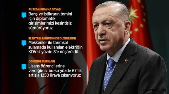Cumhurbaşkanı Erdoğan Ukrayna gündemli Bakanlar Toplantısı sonrasında kritik açıklamalarda bulundu. Cumhurbaşkanı Erdoğan, Rusya Ukrayna savaşıyla ilgili olarak, "Montrö Sözleşmesi'nin ülkemize verdiği yetkiyi kullanma kararındayız" dedi. Erdoğan, bölgesel dengelerin milli çıkarlar çerçevesinde gözetileceği vurgusu ayptı. Erdoğan ayrıca ülkede yaşanan enflasyon ve ekonomik krizle ilgili olarak yaz aylarına işaret etti. Elektrikte KDV'nin yüzde 18'den yüzde 8'e düşürüldüğünü bildirdi.Erdoğan, "28 Şubat darbesi tarihimizin kara sayfalarından biri olarak tarihimize kazınmıştır. Darbe şakşakçılarının desteği ile ortaya çıkan 28 Şubat vakası tüm benzer olaylar gibi zaman içinde milli irade tarafından elbette tasfiye edilmiştir.” açıklamasında bulundu.Erdoğan, Rusya-Ukrayna savaşıyla ilgili olarak, "Bu süreçte barış ve istikrarın temini için çok yönlü diplomatik girişimlerimizi kesintisiz sürdürdük, sürdürüyoruz." açıklaması yaptı. Erdoğan, "Bugüne kadar 5 bin vatandaşımız Ukrayna topraklarından ayrılarak ülkemize ve diğer ülkelere geçti. Taleplere göre tahliye işlemlerini sürdüreceğiz" dedi.İşte Erdoğan'ın açıklamalarından öne çıkan başlıklar:Türkiye, BM, NATO ve AB başta olmak üzere içinde yer aldığı kurumlar ve ittifaklar çerçevesindeki sorumluluklarını bugüne kadar harfiyen yerine getirmiştir. Bundan sonra da getirmeye devam edecektir.Kendi milli çıkarlarımızdan elbette ödün vermeyeceğiz ama bölgesel ve küresel dengeleri de ihmal etmeyeceğiz.Ülkemizin son dönemdeki tüm sınamalar gibi Karadeniz'in kuzeyindeki krizi de selametle atlatacağımızdan kimsenin şüphesi olmasın.Montrö Sözleşmesi'nin ülkemize verdiği yetkiyi kullanma kararındayız.Ukrayna'nın egemenliğine ve toprak bütünlüğüne saygı gösterilmesi gerektiğini Rusya'nın saldırgan tavrının kabul edilemez görüyor, Ukrayna halkının direnişini takdirle karşılıyoruz.ELEKTRİKTE KDV DÜŞTÜCumhurbaşkanı Erdoğan, "Meskenler ile tarımsal sulamada kullanılan elektriğin KDV'si yüzde 18'den yüzde 8'e düşürülmüştür. Elektrikte kullanım kotası günlük 8 aylık 240 kilovatsaate çıkarıldı" açıklaması yaptı.Erdoğan, "Tüketimine göre faturalarda net yüzde 8 ile yüzde 14 oranında bir indirim sağlanmış olmaktadır. Yaz aylarıyla birlikte milletimizi günlük hayatında sıkıntıya sokan enflasyon sorununu önemli ölçüde kontrol altına almış olacağız." dedi.