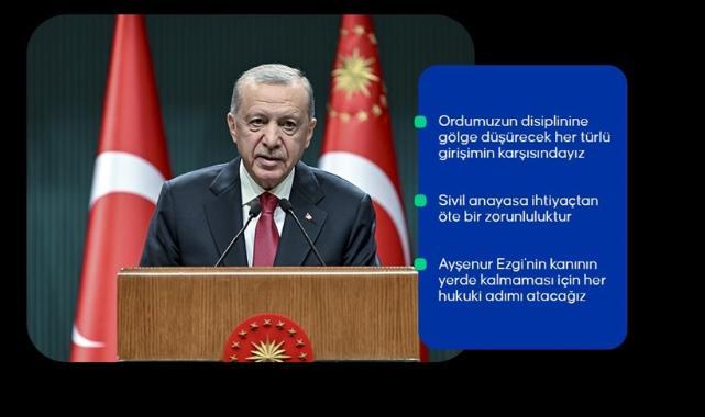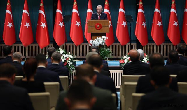 Cumhurbaşkanı Recep Tayyip Erdoğan, Cumhurbaşkanlığı Külliyesi'ndeki Cumhurbaşkanlığı Kabine Toplantısı'nın ardından millete seslendi.Ahlat'ta gerçekleştirilen son kabine toplantısından bugüne "aşk ile koşan yorulmaz" düsturuyla ülke ve millet için aşkla çalıştıklarını belirten Erdoğan, ağustos ayına damga vuran şanlı zaferlerin her sene olduğu gibi yine büyük bir coşkuyla anıldığını ifade etti.Erdoğan, 26 Ağustos'ta Anadolu'nun kapılarını millete açan Malazgirt Zaferi'nin 953'üncü yıl dönümünün gururla idrak edildiğini, 30 Ağustos Zafer Bayramı'nda da bu topraklardaki varlığı tescilleyen Büyük Zafer'in 102'nci yıl dönümünün aynı heyecanla kutlandığını söyledi.Harp okullarının mezuniyet törenlerine iştirak ederek, genç teğmenlerin ve ailelerinin mezuniyet sevincini paylaştıklarını dile getiren Erdoğan, bu sene harp okullarından 103'ü misafir olmak üzere 1613 öğrencinin mezun olduğunu bildirdi.Okul birincilerinin tamamının kadın teğmenler olmasının ayrıca anlamlı olduğunu vurgulayan Erdoğan, "Vatanına, milletine, milli iradeye ve milletin inanç değerlerine yürekten bağlı gençlerimizi Türkiye Yüzyılı'nın mimarları olarak görüyoruz. İyi yetişmiş, disiplinli, vatanperver gençlerimizle daima iftihar ediyoruz. Milletimizin göz bebeği ve peygamber ocağı olan Türk Silahlı Kuvvetlerinin gücüne güç katan her adımın yanındayız." dedi.Erdoğan, son 22 yılda "Güçlü Türkiye, Güçlü Ordu" şiarıyla her alanda çok önemli atılımlar gerçekleştirdiklerini belirterek, savunma sanayisinde yüzde 80 oranında dışa bağımlı bir ülkeyi, her türlü silah ve mühimmatını kendi imkanlarıyla üretir hale getirdiklerini söyledi. Erdoğan, Türkiye'nin İHA ve SİHA teknolojilerinde dünyanın ilk 3-4 ülkesinden birisi olduğunu kaydetti.Uçak, helikopter, tank, füze, roket, bomba, silah, gemi, denizaltı ve daha pek çok başlıkta 22 yıl öncesine göre çok farklı bir seviyede olunduğunu dile getiren Erdoğan, şöyle devam etti:"Ancak ordumuzun disiplinine, insicamına ve itibarına gölge düşürecek her türlü girişimin de karşısındayız. Demokratik denetim mekanizmaları çerçevesinde gerekli tahkikatı büyük bir hassasiyetle ve çok boyutlu bir şekilde yürütüyoruz. Kahraman ordumuzun yıpratılmasına da ordumuz üzerinden siyasi hesap görülmesine de hiçbir surette müsaade etmeyiz. Aynı hassasiyet Cumhuriyetimizin banisi, İstiklal Harbimizin Başkomutanı Gazi Mustafa Kemal için de geçerlidir."Erdoğan, dün, aslına ve Gazi'nin hatırasına uygun olarak restore edilen Savarona Yatı'nı ziyaret ettiklerini hatırlattı.
