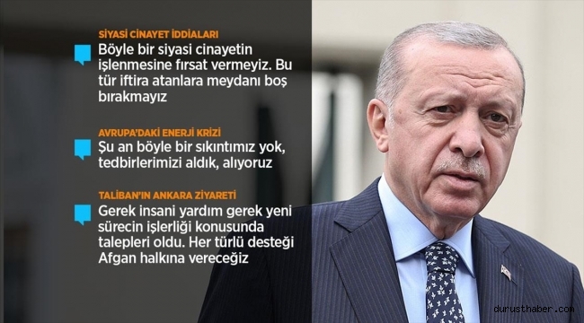 "Siyasi cinayet" iddiaları Cumhurbaşkanı Erdoğan, CHP Genel Başkanı Kemal Kılıçdaroğlu'nun "siyasi cinayetler" açıklamasının sorulması ve Ankara Cumhuriyet Başsavcılığınca iddialarla ilgili resen soruşturma başlatıldığının hatırlatılması üzerine ise şu değerlendirmelerde bulundu: