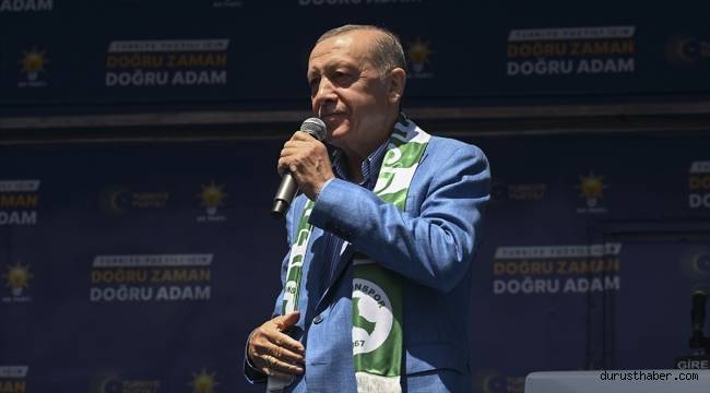 "Giresun dün Pontus çetelerine bu vatan topraklarını dar etmişti. İnanıyorum ki Giresun, bugün de Kandil'in şakşakçılarına, FETÖ'nün haşhaşilerine vatan topraklarını dar edecek. Ben biliyorum, sizler ne soğana ne patatese evelallah liderinizi kurban etmezsiniz." diyen Erdoğan, Giresun'un dün Yıldırım'ın, Fatih'in, Yavuz'un emanetini yere düşürmediğini, bugün de şehitlerin, gazilerin, kahramanların emanetlerine sıkı sıkıya sahip çıkacağını belirtti.Giresun'un geçmişte manda ve himaye planlarını yırtıp çöpe attığını ifade eden Cumhurbaşkanı Erdoğan, şöyle konuştu:"İnanıyorum ki Giresun, bugün de yeni mandacıları hüsrana uğratarak emperyalistlerin heveslerini kursaklarında bırakacak. Giresun türküsünde, 'Bu benim sevdalığım ancak ölünce biter.' diyor. Evet bizim Giresun'a olan sevdamız, Türkiye'ye olan sevdamız da son nefesimize kadar sürecek. Başları, Abdal Musa Tepesi'nden daha dik olan Giresunlu kardeşlerim, ondan, bundan korkmaz. Yürekleri Karadeniz kadar engin olan Giresunlu kardeşlerim bizden başkasına meyil etmez. Giresun bizimle olduğu müddetçe Allah'ın izniyle her engeli aşarız, her derdi çözeriz, her meselenin üstesinden geliriz.""Güvenlik bariyerlerimizi yıkıp şehirlerimizi yeniden kana ve ateşe boğarlar"14 Mayıs'ın çok önemli olduğunu vurgulayan Erdoğan, şunları kaydetti:"Sadece sizin oy kullanmanız yeterli değil. Bununla beraber en az bir komşunuzu, eşinizi, dostunuzu sandığa götürerek bize, Cumhur İttifakı'na oy vermesini sağlamanız lazım. Aksi takdirde ne olur biliyor musunuz? Bizim Irak ve Suriye'de tepelerine bindiğimiz, nefes alamaz hale getirdiğimiz teröristler var ya işte onlar gelir yeniden bu ülkenin başına musallat olur. Sadece ülkemize değil milletimizin inancına, değerlerine saldıran FETÖ'cü hainler var ya işte onlar gelir, yeniden çocuklarınızı ellerinizden alır. Zorlu bir mücadelenin ardından ayaklarını ülkemizden kestiğimiz emperyalistler var ya işte onlar gelir, bizi yeniden kendilerine bağımlı kılar. Bunu nasıl mı yaparlar? Karadeniz'de bulduğumuz gazın vanasını kapatırlar, Gabar'da bulduğumuz petrolün çıktığı kuyuların üzerine geçmişte olduğu gibi beton dökerler. Sınırlarımızın ötesinden başlattığımız güvenlik bariyerlerimizi yıkıp şehirlerimizi yeniden kana ve ateşe boğarlar.""Kürt kardeşlerim, Kandil'dekilere bakıp da sakın yanlış yola gitmesinler""Şu anda cezaevinde olan Selo var ya, Diyarbakır'da Kürt kardeşlerimi sokağa döktü, arabalarla üzerlerinden geçtiler." ifadesini kullanan Erdoğan, şöyle devam etti:"Şimdi ne diyor bunlar? Bay bay Kemal 'Gelince onu çıkaracağız, Selo ne yaptı?' diyor. Daha ne yapacak? 51 Kürt kardeşimi bunlar öldürdüler. Utanmadan, sıkılmadan bizim Yasin Börü evladımızı şehit ettiler. Şimdi de diyorlar ki bunun suçu ne? Daha ne olacak bay bay Kemal. İşte bakın, Kandil'den selam geliyor bay bay Kemal'e. Ne diyor? 'Desteğimiz onunla.' Ya bu Kandil'dekiler, Kürt kardeşlerimi tenzih ediyorum, Kürt kardeşlerimle bunların benzer yanı yok. Hiç alakası yok. Ama bunların dini, ezanı, kitabı yok. Bunlar kitapsız. Benim Giresunlu kardeşlerim bunların önünü açar mı? Ama Kürt kardeşlerim bu Kandil'dekilere bakıp da sakın yanlış yola gitmesinler."Erdoğan, gelecek günlerde Van'a gideceğini, orada yapacağı konuşmada da bu konuları işleyeceğini anlattı.Cumhurbaşkanı Erdoğan, sözlerini şöyle sürdürdü:"Kürt kardeşlerimi çok aldattılar, hala da aldatıyorlar. Bu oyunu, 14 Mayıs'ta bozmaya var mıyız? Ben size inanıyorum. Savunma sanayisindeki işe yarar ürünlerimize el koyacaklarmış, bütün çalışmaları akamete uğratacaklarmış. İşte görüyorsunuz. İstanbul'da, Atatürk Havalimanı'ndaki ülkemizin adeta teknoloji vitrini haline gelen Teknofest'i hazmedebildiler mi? Şimdiden aynı yeri Amerikalı şirketlere devretme sözü veriyorlarmış. Ya sizin o Amerika'dan görüştüğünüz kişilerle ben 15 sene önce görüştüm. 'Biz Türkiye'de yatırım yapmak istiyoruz' dediler. 'Gelin, yapın, ne istiyorsanız sizlere vereceğim.' dedim. 15 yıl oldu, gelmediler. Niye? Bunlar vatansever, milliyetperver değil. Bunlar Türkiye'ye gelip de bu tür yatırımlara girmezler. Burada, bu yatırımları yapanlar zaten ortada. İşte, İHA'ları, SİHA'ları, Kızılelma'yı, Akıncı'yı yapan Baykar. Bu milletin öz evlatlarıyla onları mukayese edemeyiz.""Londra'dan tefeciler, bunlara 300 milyar dolar verecekmiş"Cumhurbaşkanı Erdoğan, muhalefetin, ekonomide büyük mücadeleler ve fedakarlıklar sonunda kurdukları yerli ve milli modeli yıkıp ülkeyi tekrar tefecilerin at koşturduğu bir yer haline getireceğini belirterek, şunları kaydetti:"İngiltere'den, Londra'dan tefeciler bunlara 300 milyar dolar verecekmiş. İnanıyor musunuz? Böyle bir şey olabilir mi? Şimdi Giresun'a gelmiş. Böyle utanmazlık olmaz. Fındığa, 4 dolar zam verecekmiş. Bugüne kadar nereyeydiniz, niye bugüne kadar vermediniz? Çayı anlamaz, fındığı görse tanımaz ama bol bol yalanı söyler. Bu konuda üzerine yok. Allah bunlara fırsat vermesin. İnşallah 14 Mayıs'ta sizler de bunlara fırsat vermeyeceksiniz."Erdoğan, partisinin Giresun Valiliği yanındaki İnönü Caddesi'nde düzenlediği mitingde yaptığı konuşmada, Giresun'un şimdiden kararını verdiğini, 14 Mayıs'ta tercihini doğrudan yana yapacağını vurguladı.Giresun'un 21 yıl öncesine dikkati çeken ve geçen sürede yapılan hizmetleri anlatan Erdoğan, konuşmasına şöyle devam etti:"Şu sahil yolu var mıydı? Samsun'dan çık, ta Hopa'ya kadar böyle bir yol yoktu. Şimdi benim yaşıtlarıma soruyorum. Siz Armelit Dağı'nı iyi bilirsiniz değil mi? O burunlu otobüslerle Armelit Dağı'ndan nasıl çıkar, nasıl inerdik? Virajlar… Ben çocuğum, bakardım camdan aşağı 'Nered