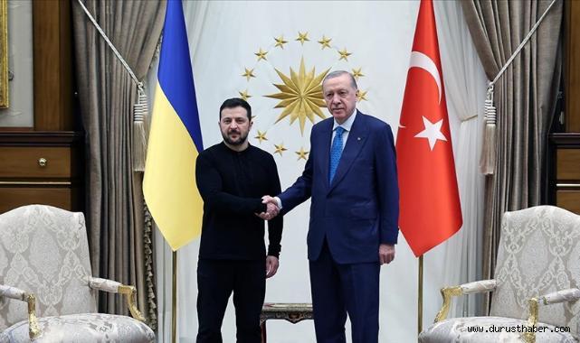 Cumhurbaşkanı Erdoğan, Zelenskiy'i, Cumhurbaşkanlığı Külliyesi giriş kapısında karşıladı.Erdoğan ve Zelenskiy, merdivenlerde Türk ve Ukrayna bayrakları önünde fotoğraf çektirdi.
