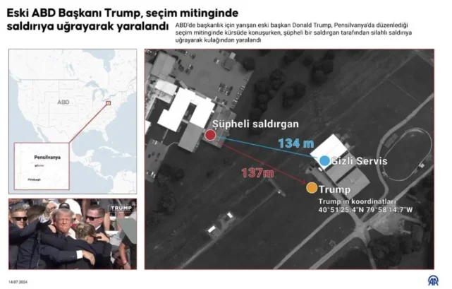 "Bırakın ayakkabılarımı alayım"Güvenlik görevlileri Trump'ı ayağa kaldırırken, başkan adayının "Bırakın ayakkabılarımı alayım" dediği belirtildi.Birkaç dakika sonra Trump ayağa kaldırıldı ve hızlı bir şekilde sahneden konvoyuna götürüldü. Ayağa kalktığında Trump'ın yüzünün kan içinde kaldığı görüldü.Korumalarının omzuna tutunarak aracına binen Trump, yumruğunu havaya kaldırdı ve kalabalığa "Dövüşün!" diye bağırdı.Saldırı nasıl gerçekleştirildiABD Gizli Servisi'ne göre, miting alanının dışındaki yüksek bir konumdan sahneye doğru birden fazla el ateş edildi. Güvenlik görevlileri saldırganı etkisiz hale getirdi.FBI, silahlı saldırganın Bethel Park'tan 20 yaşındaki Thomas Matthew Crooks olduğunu tespit etti. Saldırının hangi motivasyonla gerçekleştirildiğini araştırıldığı bildirildi.CNN tarafından yapılan bir analize göre Trump saldırgandan yaklaşık 120-150 metre uzakta bulunuyordu.Görgü tanığının açıklamaları ortaya çıktıBBC News'e konuşan bir görgü tanığı, saldırganın elinde bir tüfekle güvenlik çemberinin hemen dışındaki alçak bir binanın çatısına tırmandığını ve yakındaki polis memurlarına bağırarak onları potansiyel tehdit konusunda uyardığını söyledi.M16'nın yarı otomatik sivil modeli olan AR-15 kullandıSaldırganın M16'nın yarı otomatik sivil modeli olan AR-15 kullandığı tespit edildi.150 metrelik mesafenin ABD ordusunda acemi erlerin temel eğitimde M16 tipi otomatik tüfeğiyle insan boyutundaki hedefleri vurmaları istenen mesafeye tekabül ettiği belirtildi.Saldırgan dahil 2 kişi öldüButler Bölge Başsavcısı Richard Goldinger, Trump'ın seçim kampanyası sırasında meydana gelen saldırıda, ateş eden kişinin ve olay yerinde bulunan bir kişinin öldüğünü bildirdi.Goldinger, "Seçim kampanyası sırasında meydana gelen saldırıda, ateş eden kişi ve olay yerinde bulunan bir kişi öldü." ifadesini kullandı.