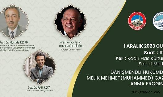 Kayseri Büyükşehir Belediyesi, kültür sanat faaliyetleri kapsamında Kayseri Valiliği ile birlikte Danişmendli Hükümdarı Melik Mehmet Gazi’yi Anma Programı düzenliyor.