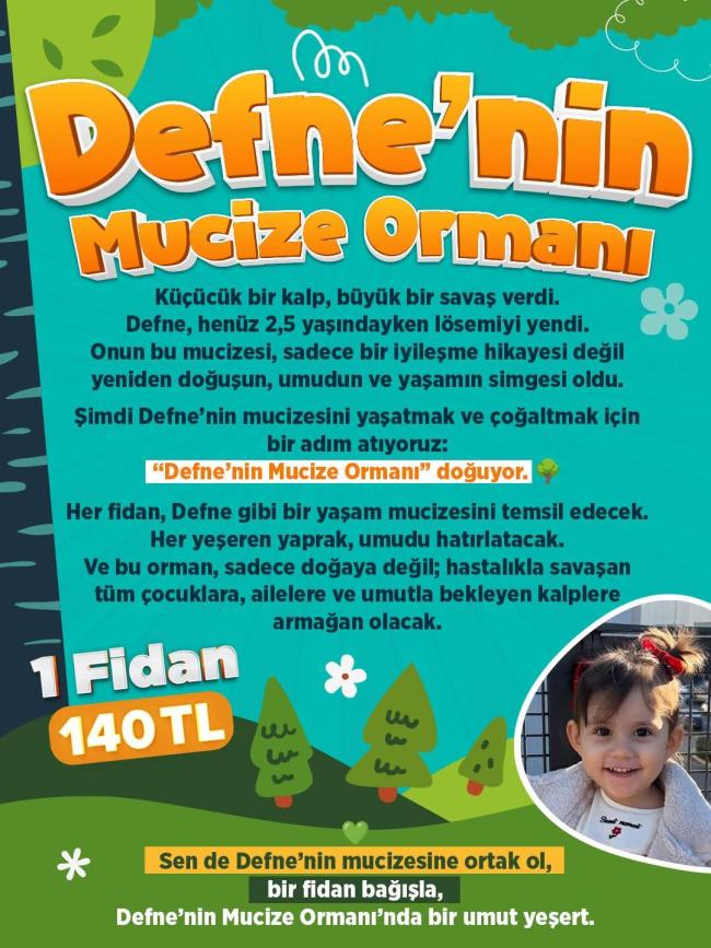 Kayseri’de lösemiyle verdiği zorlu mücadeleyi henüz 2,5 yaşındayken kazanan Defne’nin hikâyesi, şimdi çok daha büyük bir iyilik hareketine dönüşüyor. Minik Defne’nin yaşama tutunuşundan ilham alınarak başlatılan “Defne’nin Mucize Ormanı” projesi, hem doğayı yeşertmeyi hem de hastalıkla savaşan çocuklara moral olmayı amaçlıyor.
