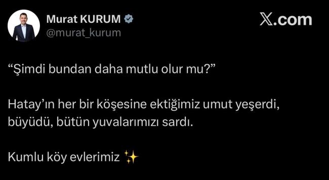 Bakan Kurum, Kumlu köy evlerinin görüntüleriyle birlikte yaptığı paylaşımda, Hatay'ın yeniden inşası sürecindeki kararlılıklarını vurguladı. Kurum mesajında, Hatay'ın her bir köşesine ektiğimiz umut yeşerdi, büyüdü, bütün yuvalarımızı sardı. Kumlu köy evlerimiz ifadelerini kullanarak deprem bölgesindeki ihya ve inşa çalışmalarının hız kesmeden devam ettiğinin altını çizdi.
