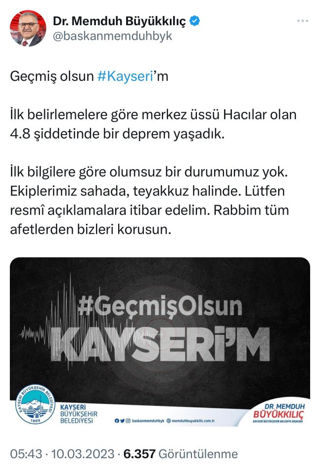 Kayseri Büyükşehir Belediye Başkanı Memduh Büyükkılıç tarafından Kayseri’de yaşanan 4,9 şiddetindeki deprem sonrası ilk belirlemelere göre olumsuz bir durum olmadığı bildirildi.