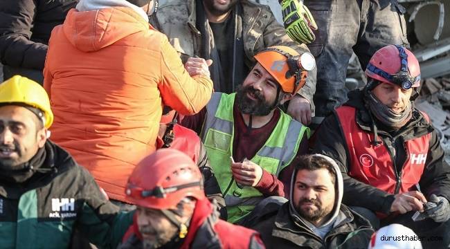 Hatay'ın Antakya ilçesi Güzelburç Mahallesi'nde yıkılan 600 Konutlar Sitesi'nde depremden 101 saat sonra kurtarılan inşaat mühendisi 30 yaşındaki Hikmet Yiğitbaş, enkazdan çıkarılıp ambulansa alındıktan sonra arama kurtarma gönüllüsü Mustafa Aydın'a sarıldı.