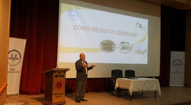 Kilis İl Müftülüğü, Prof. Dr. Alaeddin Yavaşça Kültür Merkezi’nde İmam Hatip ve Müezzin Kayyımlara, İl Müftülüğü Konferans Salonu’nda ise Kur’an Kursu Öğreticilerine yönelik Din Görevlileri buluşması programları düzenledi.KİLİS (İGFA)- Programlar Kur’an-ı Kerim tilavetiyle başladı. Ardından İl Müftü Vekili Recep Çarpar mutad toplantı gündem maddelerini değerlendirdi. Programa Diyanet İşleri Başkanlığı Başmüfettişi Dr. Dursun Aygün, Müfettiş Yardımcı Ali Güngör, İl Müftüsü Abdurrahman Şahin, İl Müftü yardımcıları, İlçe Müftüleri, Şube Müdürleri ve Din görevlileri katıldı.Programa konuşmacı olarak katılan Başmüfettiş Dr. Dursun Aygün, Din Hizmetlerini yürüten personelin cami içi ve cami dışı etkinlik ve verimliliğini artırmak, görev heyecanlarını ve hizmet kalitelerini yükseltmek amacıyla, Din Görevlilerine “Etkili Din Görevlisi Etkin Din Hizmeti” konulu seminer verdi. Dr. Aygün; “Görevin etkin, verimli ve başarılı bir şekilde yapılabilmesi görev bilincine, bu ise bir takım ilkelere ve niteliklere sahip olmaya bağlıdır. Bu ilkeler, görevin mahiyetini ve önemini çok iyi kavramak, kurumsal aidiyet ve mensubiyet, görevi ev iyi ve tam olarak yapma bilincidir.” dedi.Din Hizmetinde Gönüllülüğün esas olduğunu belirten Dr. Aygün; “Din görevlisi işi canı gönülden, büyük bir aşk ve şevkle, varını yoğunu ortaya koyarak, bir anne misali yapmalıdır.” ifadelerini kullandı.