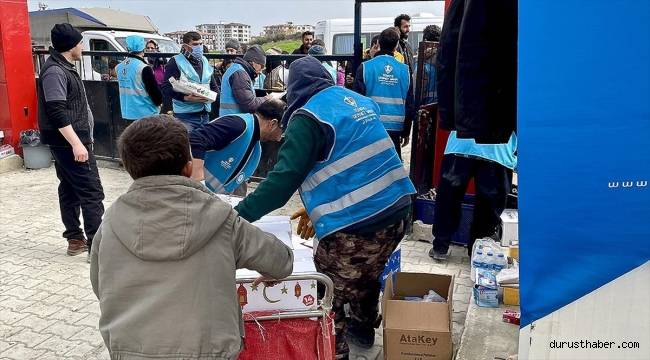 "Asrın felaketi" olarak nitelendirilen Kahramanmaraş merkezli depremlerde büyük yıkımın yaşandığı Antakya'da, enkaz kaldırma çalışmaları sürerken, Türkiye'nin dört bir yanından gelen yardımların afetzedelere ulaştırılmasında sivil toplum kuruluşlarının çalışmaları devam ediyor.Diyanet İşleri Başkanlığı ile Türkiye Diyanet Vakfı da Antakya'da 650 gönüllüsüyle insani yardım çalışmalarıyla afetzedelere destek oluyor.Onlarca caminin yıkıldığı ve çoğunun da ağır hasar aldığı kentte 13 çadır mescit kuran Diyanet İşleri Başkanlığı, burada manevi danışmanlık ve rehberlik sertifikalı gönüllüleriyle hizmet veriyor.Merkez mutfak başta olmak üzere 4 mobil mutfakta 8 bin kişiye üç öğün sıcak yemek ikramında bulunan ekipler, kırsal kesimler dahil depremzedelere meyve, sebze başta olmak üzere günde 6 bin yardım kolisi ulaştırıyor."Onları mutlu edebilirsek ne mutlu"