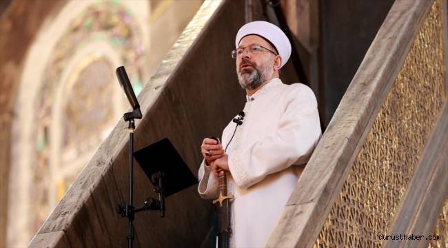 Erbaş, Ayasofya-i Kebir Cami-i Şerifi'nde okuduğu "Hayatın tekrarı yok" başlıklı yılın son cuma hutbesinde, Hz. Peygamberin "Dünyada bir garip, yahut bir yolcu gibi ol." hadisini hatırlattı.Hayatın, akıp giden su gibi olduğunu, ezanla başlayıp selayla biten ömrü "önce yeşeren sonra da sararıp dökülen yaprak misali" şeklinde tanımlayan Erbaş, "Doğumun neşesi kadar, ölümün hüznü de hakikattir ve bütün yaratılmışlar için bir süre takdir edilmiştir. Aldığımız her nefeste o büyük güne biraz daha yaklaşıyoruz. Günlerimiz, aylarımız ve yıllarımız birer birer geride kalıyor. Her düşen takvim yaprağıyla ömür sermayemiz tükenip gidiyor." değerlendirmesinde bulundu.Allah'ın insana emanet ettiği ömrün bir hesabı olduğunu belirten Erbaş, "Ömrümüzden bir yılı daha geride bırakıyoruz. Vakit, hesaba çekilmeden kendimizi hesaba çekme, yaptıklarımız mizana yani tartıya girmeden amellerimizi gözden geçirme vaktidir." ifadesini kullandı.Kur'an-ı Kerim'de "O gün insana, yapıp önden gönderdiği ve yapmayıp geri bıraktığı şeyler haber verilir." ayetini aktaran Erbaş, şöyle devam etti:"Geride ne bıraktığımızı ve gelecekte ne yapacağımızı muhasebe etme vaktidir. Vakit, dünyevileşme, israf, bencillik ve sınırsız tüketim arzusuna gem vurma vaktidir. Yolumuzu doğrultma, yönümüzü bulma vaktidir. Vakit, vicdan mahkememizi kurup, hakikat aynasında kendimizi görme vaktidir. Bizi ebedi kurtuluşa erdirecek salih amelleri ömrümüze katma vaktidir. Hasılı vakit hayatımızı Kur'an ve sünnet ölçüsünde yeniden tefekkür etme vaktidir."Dünyanın bir imtihan yurdu olduğunu ve hayatın tekrarı olmadığını vurgulayan Erbaş, Allah'ın insanları yapıp ettiklerinden ve imkanı olduğu halde ihmal edip terk ettiklerinden hesaba çekeceğini dile getirdi."Hepimiz ya dinde kardeşiz ya da yaratılışta eşiz"
